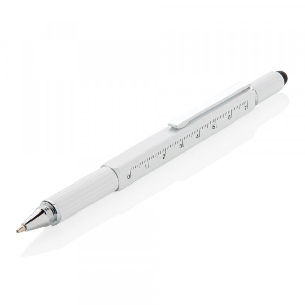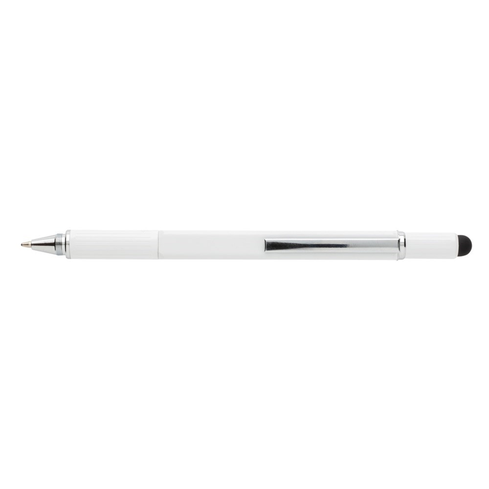 Multifunktionsstift - 400m blauschreibend - mit Skalierung ( 7cm), Wasserwaage, Schraubendreher, Stylus-Spitze. Aus Messing mit Aluminiumclip.