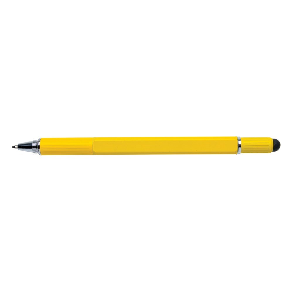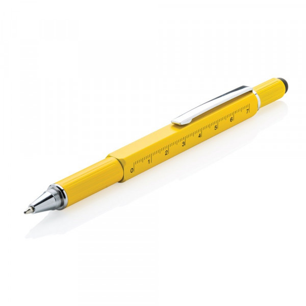 Multifunktionsstift - 400m blauschreibend - mit Skalierung ( 7cm), Wasserwaage, Schraubendreher, Stylus-Spitze. Aus Messing mit Aluminiumclip.