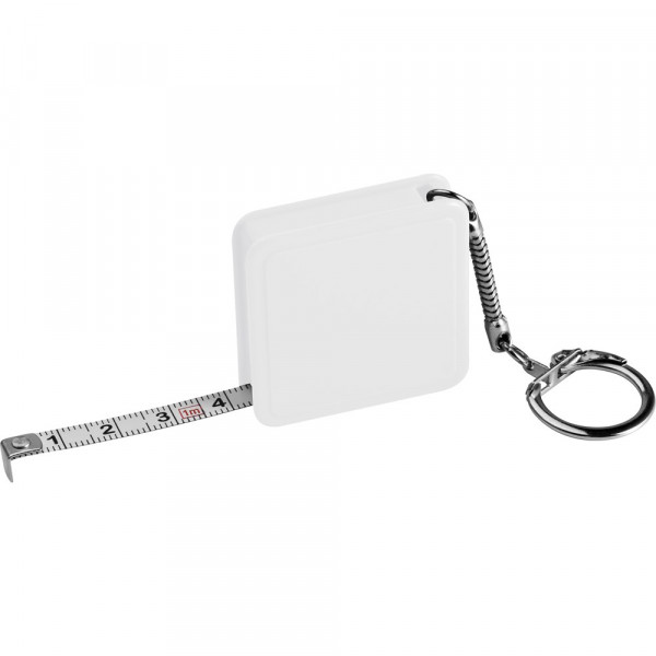 Quadratisches 1 Meter Stahlbandmaß aus Kunststoff in kräftigen Farben mit Schlüsselanhänger. Ihren Werbedruck platzieren wir auf die quadratische Fläche des Maßbandes.