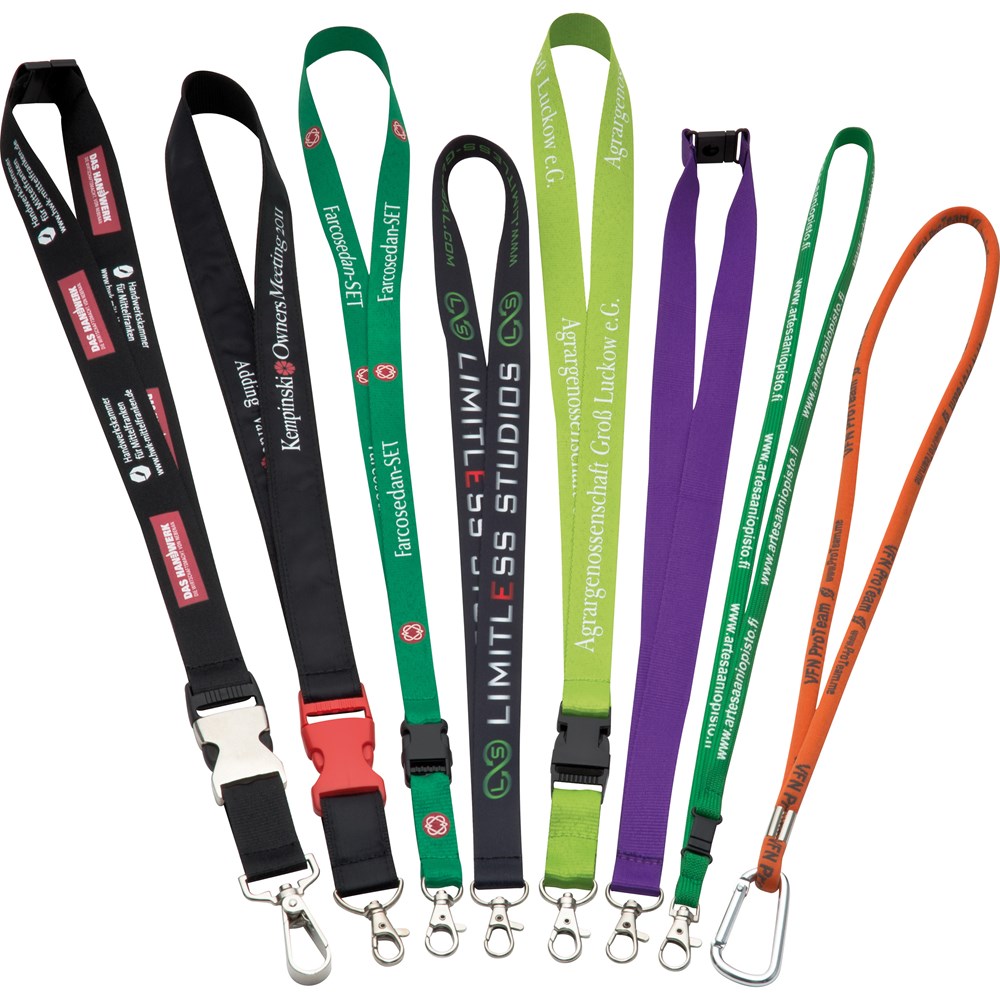 Lanyard individuell gestaltet: Sie können sie allover mit Ihrem Logo bedrucken lassen und mit vielen zusätzlichen Extras bestücken. Zur Auswahl stehen eine Vielzahl an Schlüsselringen und Karabinerhaken (D-H), Trenn- und Sicherheitshaken (A,C), Handyschlaufe (B) und Visitenkartenhaltern (KU,VI). Mindestmenge: 500 Stück. Lieferzeit ca. 2 Wochen. Gerne erstellen wir Ihnen ein Angebot für Ihre gewünschte Version. Die Lanyards werden speziell für Sie angefertigt.