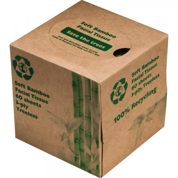 Taschentuchbox mit 60 Taschentüchern aus Bambus, 3-lagig, 100% holzfrei. Geliefert werden die Taschentücher in einer recycelten Box, aus der man die einzelnen Tücher direkt herausziehen kann. Ihre Werbung wird auf die Box gedruckt - vorzugsweise in grün.