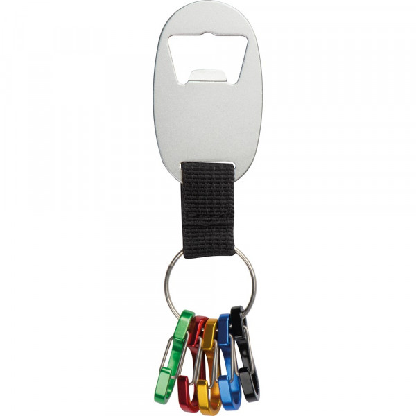 Flaschenöffner aus Metall mit Schlüsselring Polyesterband und 5 verschieden farbigen Minikarabinerhaken. Ihre Werbung wird auf den Flaschenöffner gelasert.