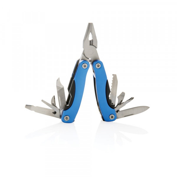 13 Funktionen, ein Multifunktionswerkzeug aus Edelstahl und mit Aluminium überzogenem Griff. Inklusive schwarzer Tasche.
