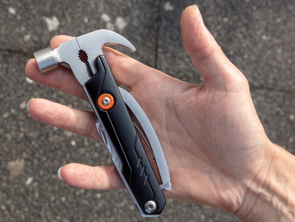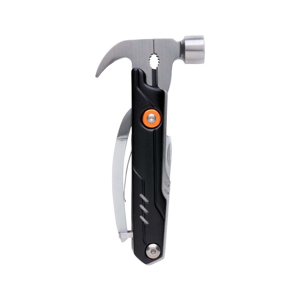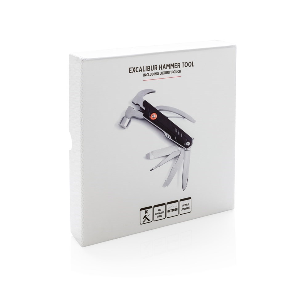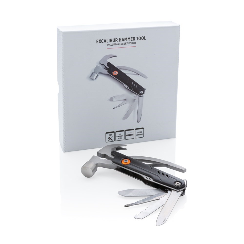 Massives Hammer-Tool mit 10 Funktionen. Im 1680D Etui sowie Geschenkbox verpackt. Aluminiumgehäuse, die Tools aus Edelstahl. Hammer, Zange, Messer, Dosenöffner, Schraubendreher uvm.