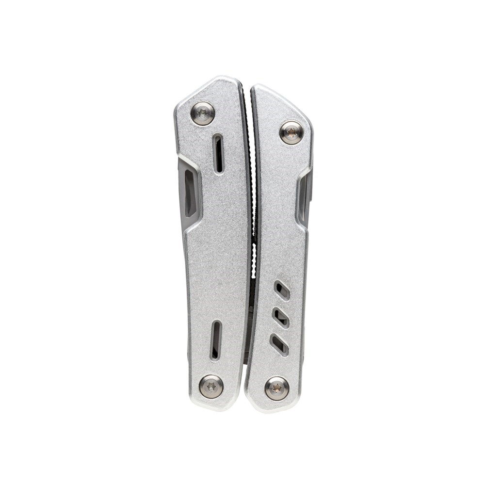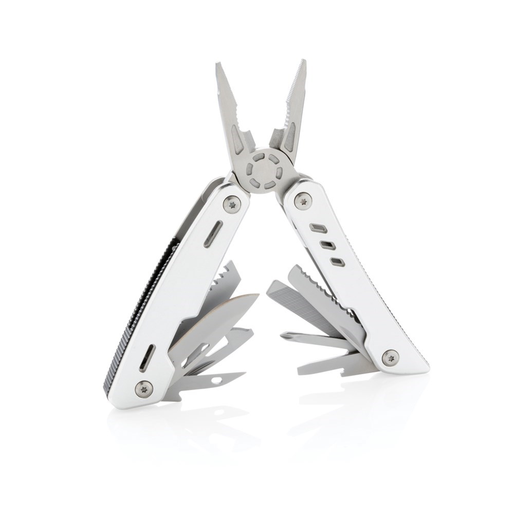Multitool im Aluminium-Case mit 12 Funktionen aus Stainless Steel wie eine Feile, Zange, Messer, Schraubendreher, Säge, Dosenöffner und vielem mehr. In Geschenkbox verpackt.