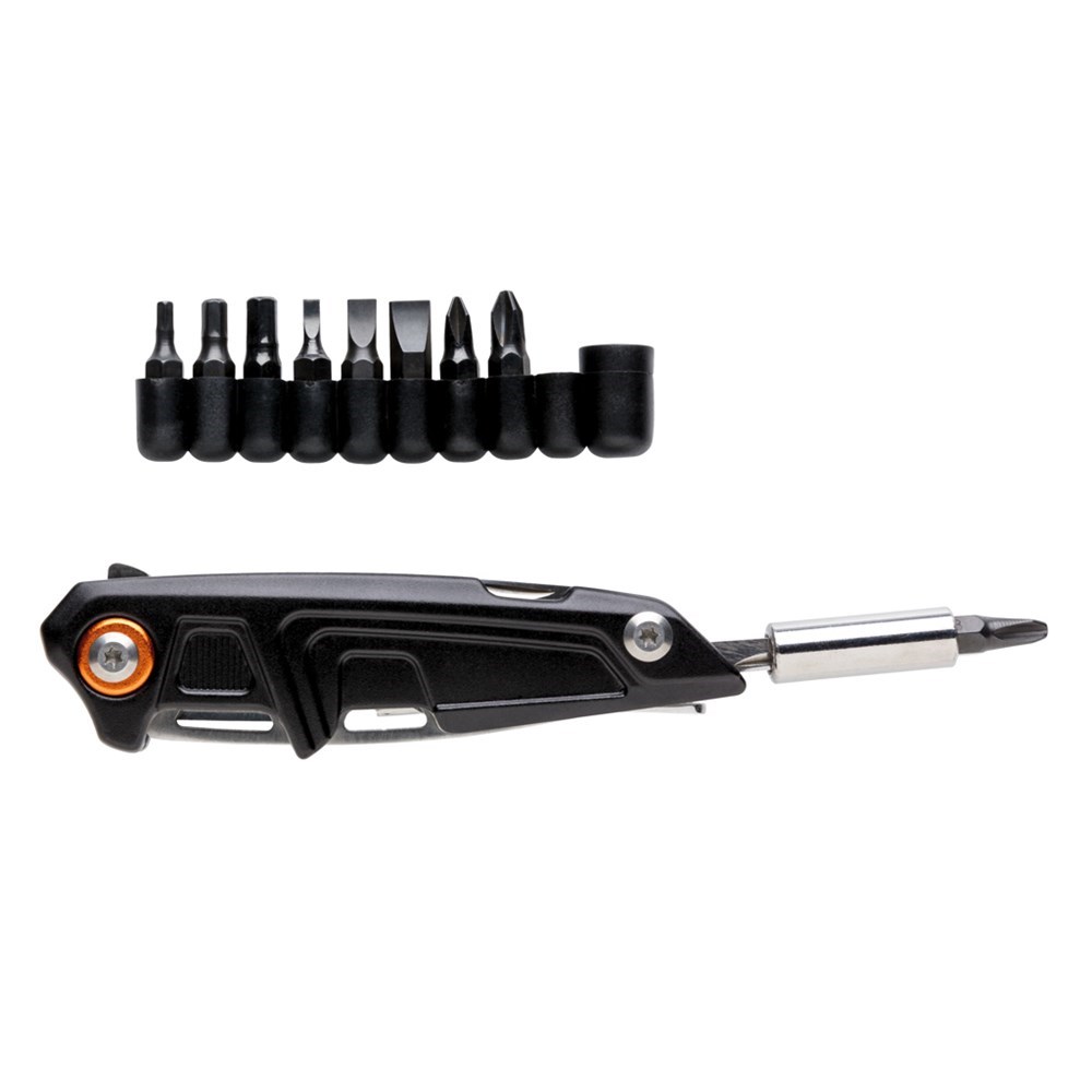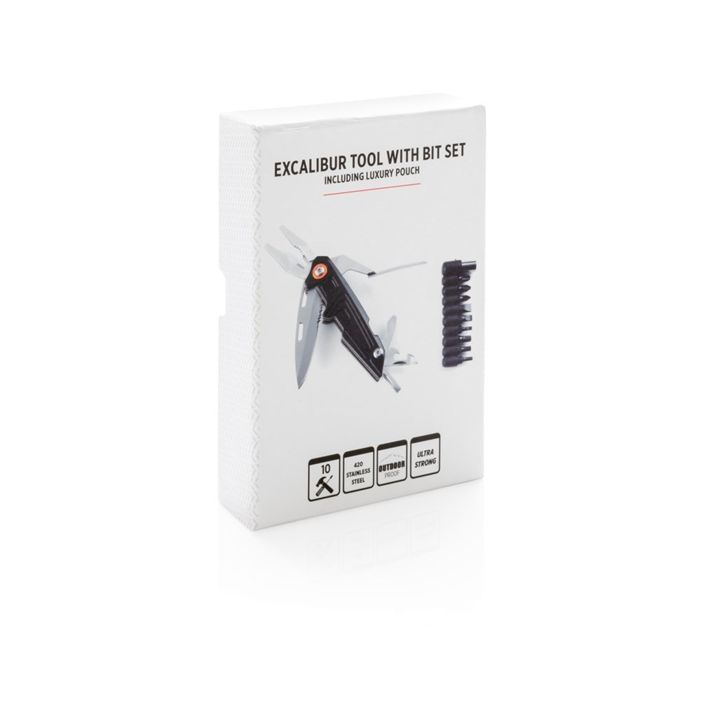Massives Tool mit 10 Funktionen und 9 zusätzlichen Bits. Im 1680D Etui sowie Geschenkbox verpackt. Aluminiumgehäuse, die Tools aus Edelstahl. Zange, Messer, Dosenöffner, Schraubendreher, Bit-Adapter, 9-in-1 Bit-Set uvm.