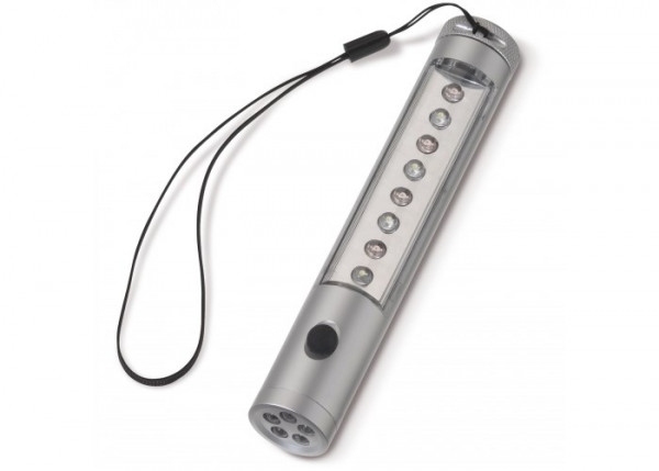 LED-Taschenlampe aus Aluminium mit je einer Lampe auf der Vorder- und Oberseite. Blitz- und statisches Licht sind möglich. Auf der Rückseite sind Magneten für einen sicheren Halt angebracht. Lieferung in einer Geschenkverpackung mit Batterien und einer Handschlaufe.