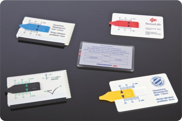 Reifenprofilprüfer im Scheckkartenformat mit Angabe der gesetzlichen Mindest-Profiltiefe und Winter-Mindestprofiltiefe. Der Werbedruck auf der Vorderseite erfolgt ohne Aufpreis, sofern er in der Skalierungsfarbe erfolgt! (Nur Druckvorkosten)2-farbige SkalaMade in Germany