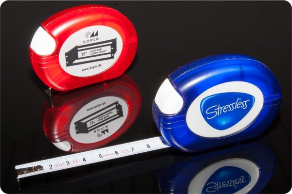 Einzigartiges Design-Bandmaß als Handschmeichler in ovaler Form mit gerader Standfläche. Stopper ist in die Außenkontur integriert. Werbung erfolgt als Druck oder Lasergravur auf der silberfarbig eloxierten Aluminium-Plakette. Made in Germany