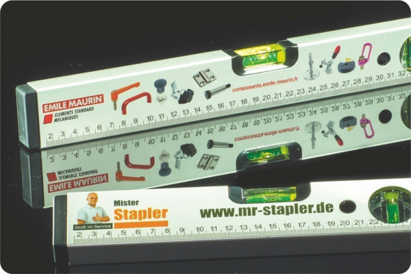 Alu-Wasserwaagen in Profi-Qualität mit folgenden Merkmalen: - 1,7mm starkes Aluminium-Profil verwindungssteif - Messgenauigkeit 0,0285° = 0,5mm/1m in Normallage - Doppelringe bei Horizontallibelle für 2% Neigung - Horizontal-Libelle leuchtet durch Fluoreszierung bei Dämmerung und Dunkelheit. - Libelle mit Lupeneffekt für bessere Ablesung - 30 Jahre Garantie Sonderfarben ab 500 Stück möglich.