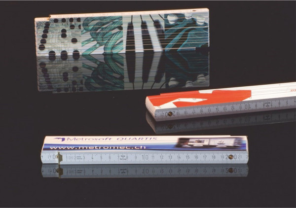 Bestseller Werbemaßstab in 15 Farben mit innenliegendem Metall-Gelenk. Winkeleinteilung auf dem 2. Glied ermöglicht Messung von Dach- oder Treppenneigung etc. 90° Einrastung der Glieder, um rechte Winkel markieren zu können.- Made in Germany -