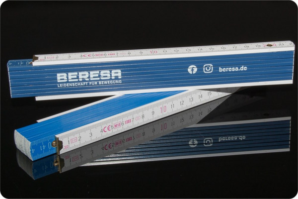 Buchenholz-Gliedermaßstab 2m der Spitzenklasse in neuer, werbewirksamer 2-Farboptik.Wählen sie aus zwei blauen Farben, die jeweils mit weißen Endgliedern kombiniert werden, den für sie passenden Maßstab aus. Mindestmenge 100 Stück. Sonderfarben ab 3.000 Stück möglich.Innenliegende, federnden Metallgelenken für leichtgängiges Öffnen und Schließen. Winkelskala auf 2. Glied zur Messung von z. B. Dach- und Treppenneigungen. Hochwertige Tauchlackierung und bündig aufeinanderliegende Glieder ideal geeignet für Mehrfarb- und UV-LED Digitaldrucke. Maßstab mit CE-Zertifizierung.