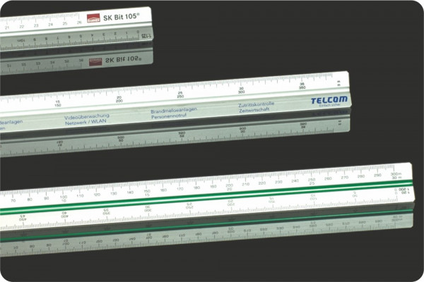 Bestseller Aluminium-Dreikantlineal 30cm mit 2 Farbstreifen in hochwertiger Qualität. Sehr präzise Ausführung für den professionellen Einsatz. 5 Wunschskalierungen frei wählbar. Der Werbedruck erfolgt auf der 6. Seite (Freileiste). Garantie 5 Jahre.