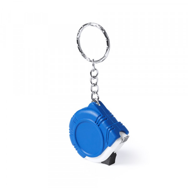 Schlüsselanhänger mit 1 m langem Metallmaßband mit Verriegelungsmechanismus. Maßangabe in Zentimeter, Zoll und Fuß. Mit spezieller Stanzung zum Bedrucken.