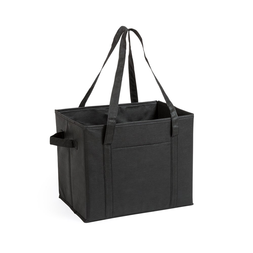 Non-Woven-Klappbox für den Kofferraum aus resistentem Faservlies in lebendigen Farben. Mit verstärkten Tragegriffen, Seitengriff zum Herausziehen sowie Fronttasche und festem Boden.