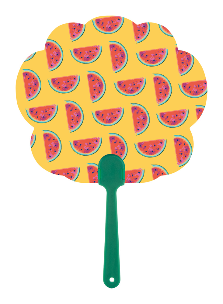 Fächer aus laminiertem Papier mit Kunststoffgriff und vollfarbigen Druck auf beiden Seiten. Der Preis ist inkl. Digitaldruck. Mindestmenge: 100 Stk.