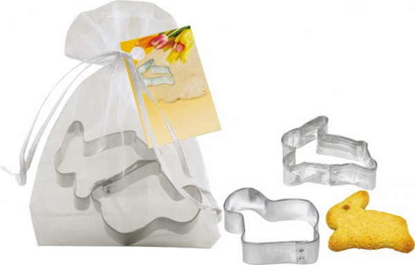Im hübschen Organzasäckchen befinden sich zwei Backförmchen für Ihre Osterbäckerei. Die langlebigen und immer wiederverwendbaren Ausstechformen aus Weißblech, Made in Germany, sind ein sympathisches und nützliches Giveaway für Ihre Kunden. Ihr Werbeeindruck oder eine individuelle Gestaltung der Karte ist ab 250 Stück möglich.