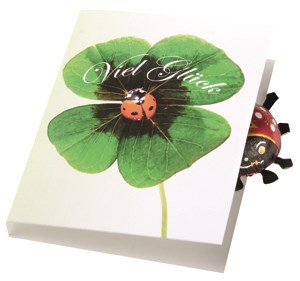 Nicht nur zu Silvester, sondern das ganze Jahr über wird Glück benötigt. Dieses Klappkärtchen enthält einen Glückskäfer (6 g) aus Vollmilch-Schokolade. Platz für den Werbedruck ist auf dem Standardmotiv der Karte oder eine eigene Gestaltung, jeweils ab 250 Stück.