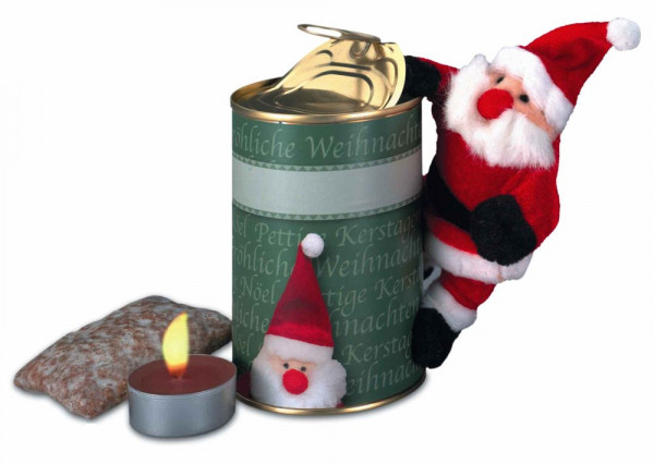 Die Dose mit Aufreißdeckel enthält einen magnetischen Weihnachtsmann, Lebkuchen sowie ein Duft-Teelicht. Ein schönes Präsent zu Weihnachten. Platz für Ihren Werbeeindruck ist auf dem Standardmotiv der Banderole oder eine eigene Gestaltung, jeweils ab 250 Stück.