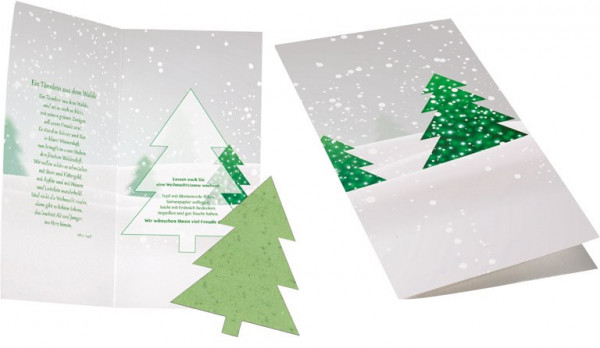 Der Tannenbaum enthält bereits Fichtensamen. Einfach auf das Erdreich legen, mit etwas Erde bedecken und gießen. Schon nach wenigen Tagen sprießen die ersten Keimlinge. Ab 250 Stück ist Ihre Werbebotschaft auf dem Standardmotiv oder die individuelle Gestaltung der Karte möglich. Ein Kuvert ist separat erhältlich, Artikel 6101 oder 6104.