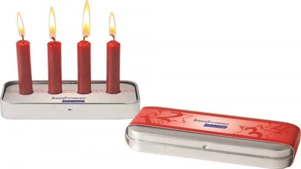 Traditionell werden in der Adventszeit nacheinander 4 Kerzen angezündet. Unser Pocket-Adventskranz findet überall Platz und kann jedes Jahr wieder verwendet werden. Praktisch in einer Metallbox verstaut, lässt er sich einfach überreichen. Platz für Ihren Werbeeindruck (ab 250 Stück) ist auf den Standardmotiven des Steckeinsatzes und der Banderole oder jeweils eine eigene Gestaltung ab 250 Stück.