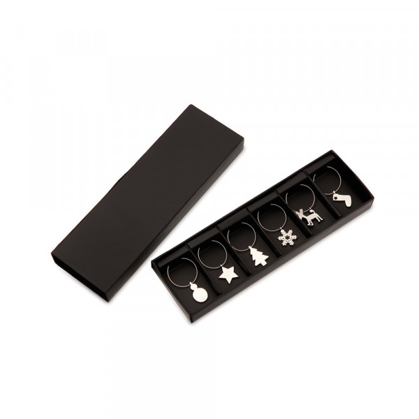 Glasmarkierer aus Metall mit 6 verschiedenen Weihnachtsmotiven in glänzender Metallic-Ausführung. Präsentiert in einer Schachtel mit einzelnen Fächern.