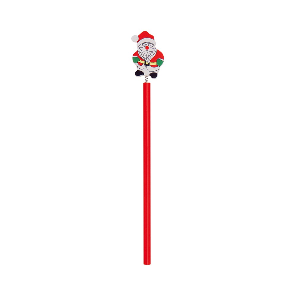 Origineller Holzbleistift mit Weihnachtsdesign in leuchtendem Rot und mit Weihnachtsfigur am oberen Ende. Ungeschliffene Spitze.