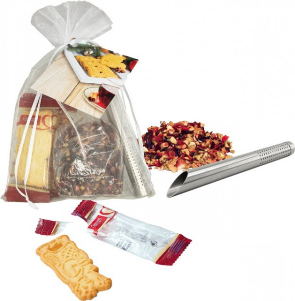 Eine kurze Auszeit im Alltagsstress. Das gelingt mit einer weihnachtlichen Teestunde. Das formschöne Edelstahlteesieb ist mit dem Weihnachtsfrüchtetee schnell und einfach gefüllt, dazu leckere Butterspekulatius-Kekse. Das Anhängekärtchen bietet im Standardmotiv viel Platz für Ihren Werbeeindruck. Eine individuelle Gestaltung ist auch ab 250 Stück möglich.
