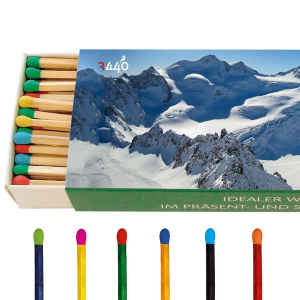 Streichholzschachtel Inhalt: ca. 50 Streichhölzer Maße: 195 x 65 x 25 mm³ Holzfarben: natur Kopffarben: rot, weiß (auf Anfrage) Preise inkl. 1 Druckfarbe aus der Euroskala/CMYK (ohne Sonderfarben). Jede weitere Druckfarbe gegen Aufpreis. Schwarze/farbige Hölzer gegen Aufpreis. Freie Wahl der Kopffarbe ohne Aufpreis.