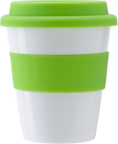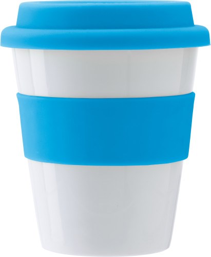 Trinkbecher aus Kunststoff, Deckel mit Trinköffnung und farbigen Applikationen, Inhalt ca. 350 ml.