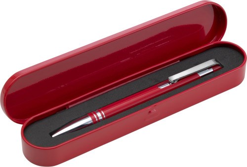 Kugelschreiber aus Aluminium, farbig lackiert, mit Metall-Clip, Etui aus Metall und schwarzer Mine.