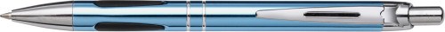 Kugelschreiber aus Metall, mit Metall-Clip und Zierringen, gummierter Griffzone und blauer Mine.