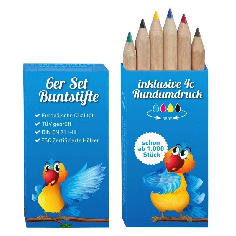 6er Set Malstifte, bestehend aus: 6 Buntstifte, natur mit feiner Schutzlasur, 6-eckig, Maße: 85 x 7 x 7 mm, Etui: inklusive individueller vollflächiger rundum Bedruckung im 4c Offsetdruck, Maße 90 x 45 x 8 mm, Gewicht: 235 g/m², Made in EU, entspricht der Spielzeugverordnung DIN EN 71/III, TüV geprüft, klimaneutral
