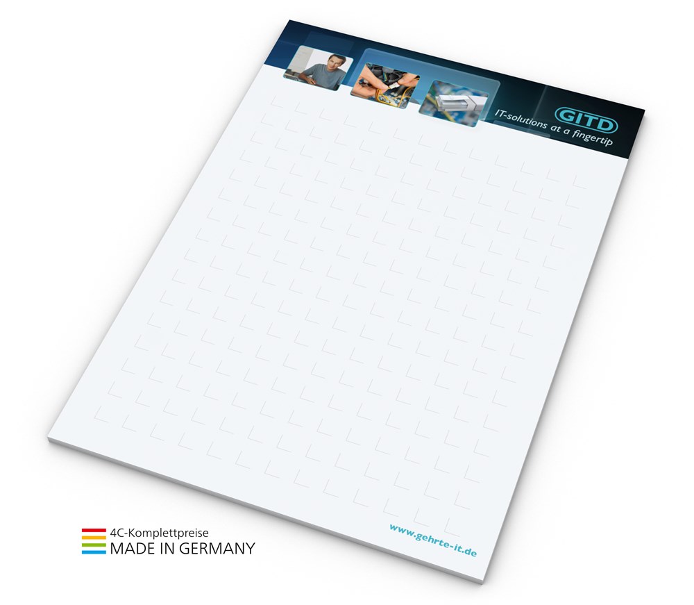 Günstiger Notizblock, der bei keinem Workshop oder Seminar fehlen darf. Format: A4, A5 oder A6 Ausstattung: Am Kopf an Pappunterlage geleimt; 25 oder 50 Blatt | Werbefläche: auf dem gesamten NotizBlock | Werbung: 4C-Druck inklusive