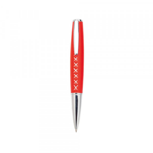 Kugelschreiber mit originellem Design aus einer weichen Kunstleder/Metall-Kombination in kräftigen Farben. Mit genähten Details in X-Form und Clip sowie Spitze in farblich passendem Silber. Blaue Tinte.