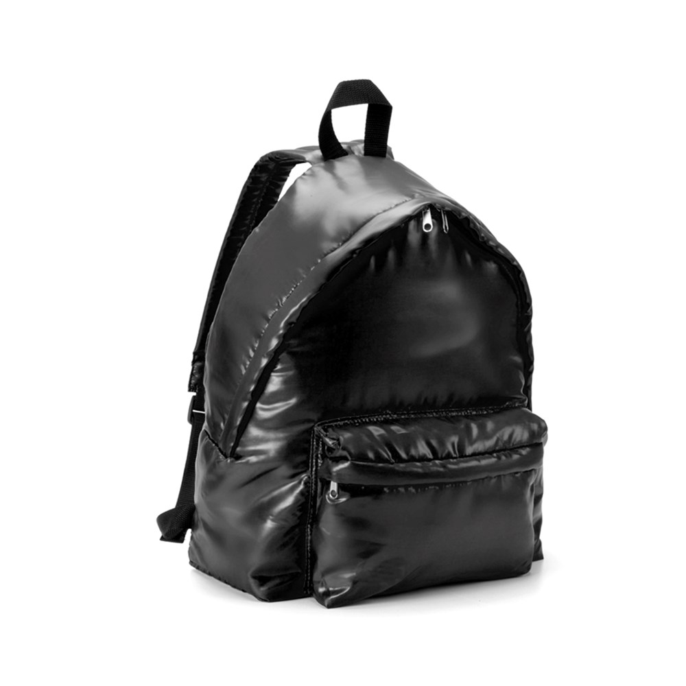 Rucksack aus originellem 240D Polyester mit Kunstleder-Beschichtung und coolem Design in einer Vielzahl von kräftigen Farben. Mit doppeltem Reißverschluss, Fronttasche, verstärkten Ecken und schwarzen Kontrastelementen. Mit gepolstertem Rückenpanel und verstellbaren Schultergurten mit Polsterung.