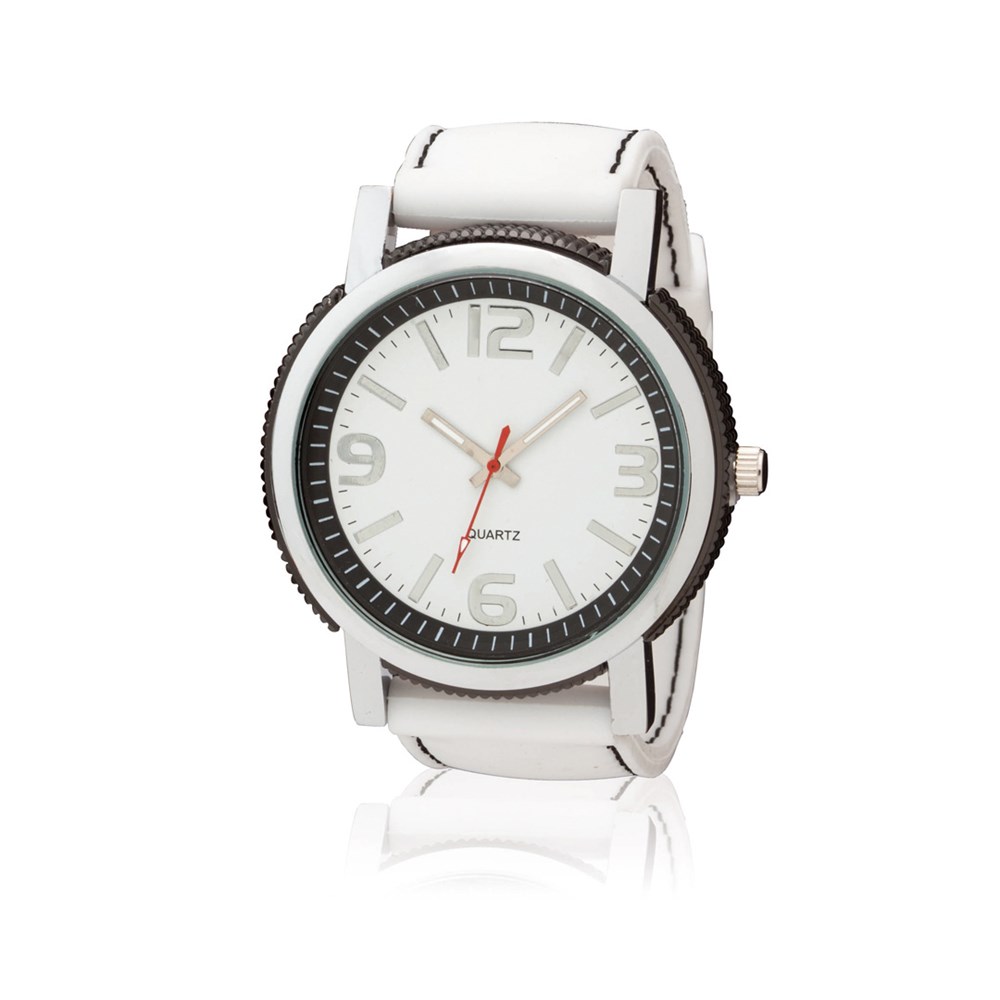 Armbanduhr mit coolem Design und kreisförmigem analogem Zifferblatt. Spritzwassergeschützt. In kräftigen Farben und mit verstellbarem Silikonarmband und weißem Klickverschluss. Präsentiert in einer individuellen Tasche mit verstärkendem Karton.