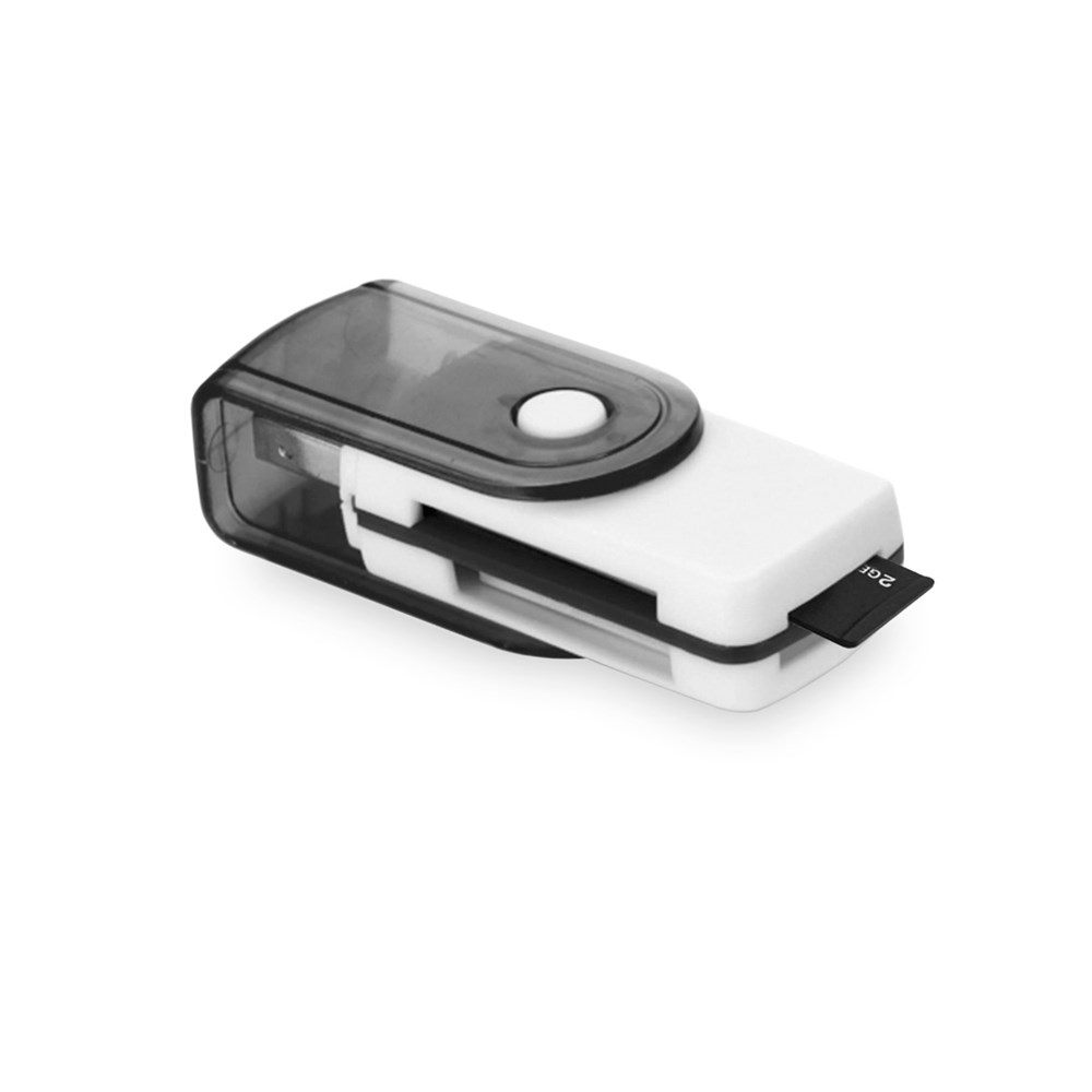 Origineller Kartenleser mit Drehöffnung, USB 2.0-Anschluss und fröhlichem zweifarbigem Design. Kompatibel mit M2, MS Duo, Micro SD und SD Karten. Präsentiert in einer individuellen Box.