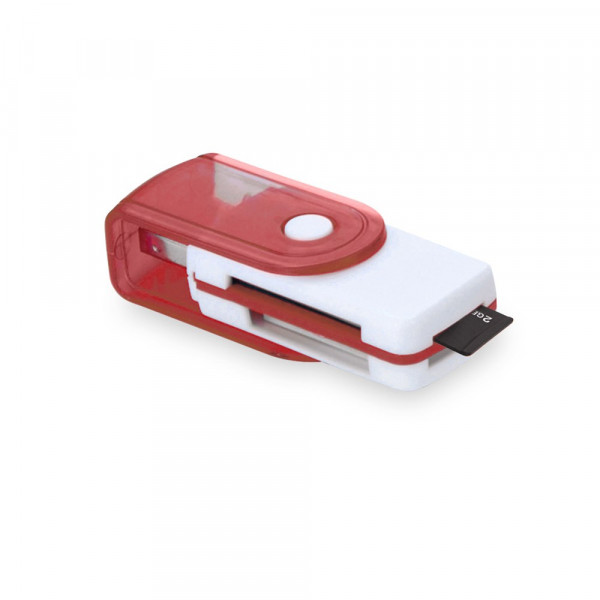 Origineller Kartenleser mit Drehöffnung, USB 2.0-Anschluss und fröhlichem zweifarbigem Design. Kompatibel mit M2, MS Duo, Micro SD und SD Karten. Präsentiert in einer individuellen Box.