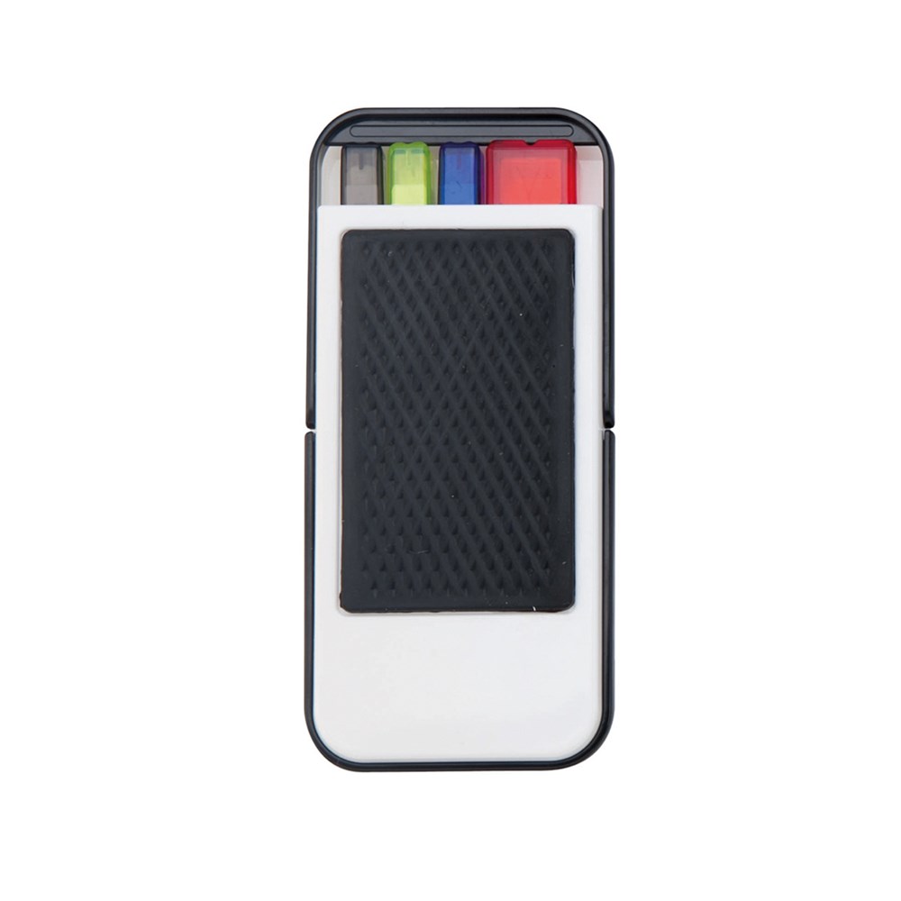 Origineller klappbarer Ständer für Smartphones mit originellem, zweifarbigem Design und rutschfester Auflage zum Anbringen. Zudem mit im Rücken integriertem Set aus Textmarker, Kugelschreiber und Druck-Bleistift sowie Reinigungstuch mit Hülle.