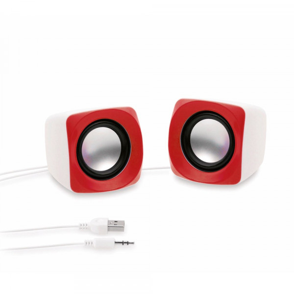 Zwei Tischlautsprecher mit minimalistischem zweifarbigem Design und 3 W Leistung. Mit 3,5-mm-Klinkenstecker und Stromversorgung durch USB-Kabel (inklusive). Präsentiert in einer attraktiven Designbox.