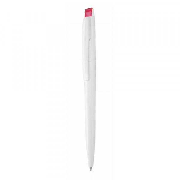 Dreh-Kugelschreiber mit auffälligem zweifarbigem Design. Geschmeidiger Schaft in solidem Weiß mit Kontrastdetails in lebendigen, halbtransparenten Farben. Mit originellem, gebogenem Clip und blauer Tinte.
