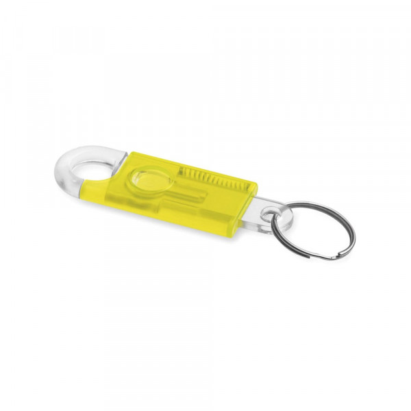 Origineller Schlüsselanhänger mit Gehäuse aus einem transparentem und einem halbtransparentem Teil in kräftigen Farben. Mit integriertem Karabiner.