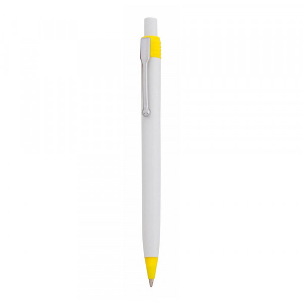 Druck-Kugelschreiber mit auffälligem zweifarbigem Design. Mit weißem geschmeidigem Schaft und Kontrastdetails in kräftigen Farben. Mit Metallclip und Jumbo-Patrone mit blauer Tinte.