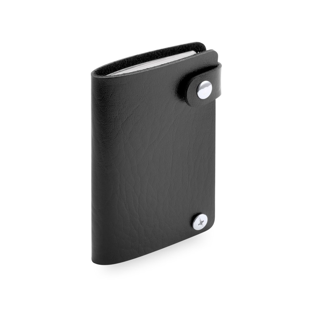 Kartenhalter aus weichem Kunstleder in auffälligen Farben mit doppeltem Druckknopfverschluss aus Metall. Mit 10 Innenfächern aus robustem transparentem PVC.