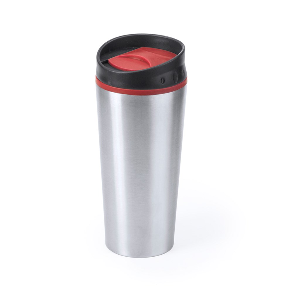 Becher aus Edelstahl mit 500 ml Fassungsvermögen. In Metallic-Ausführung mit Kontrastdetails in lebendigen Farben und Deckel mit Sicherheitsspender. Präsentiert in einer individuellen Box.