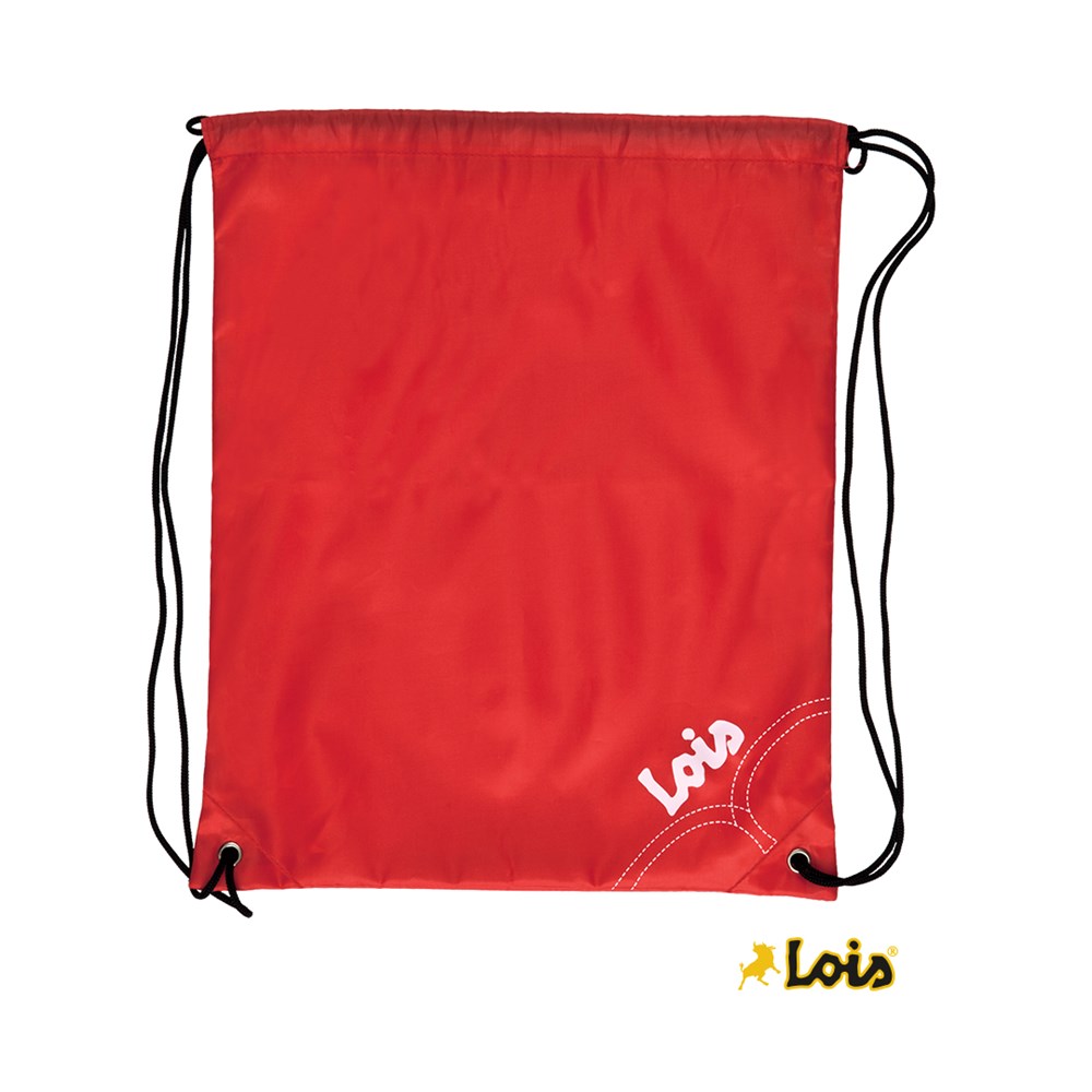 Rucksack mit Kordelzug von Lois aus weichem 210D Polyester in vielen lebendigen Farben. Mit Zugbändern in Schwarz und verstärkten Ecken mit Metallringen sowie Markenlogo in einer Ecke.