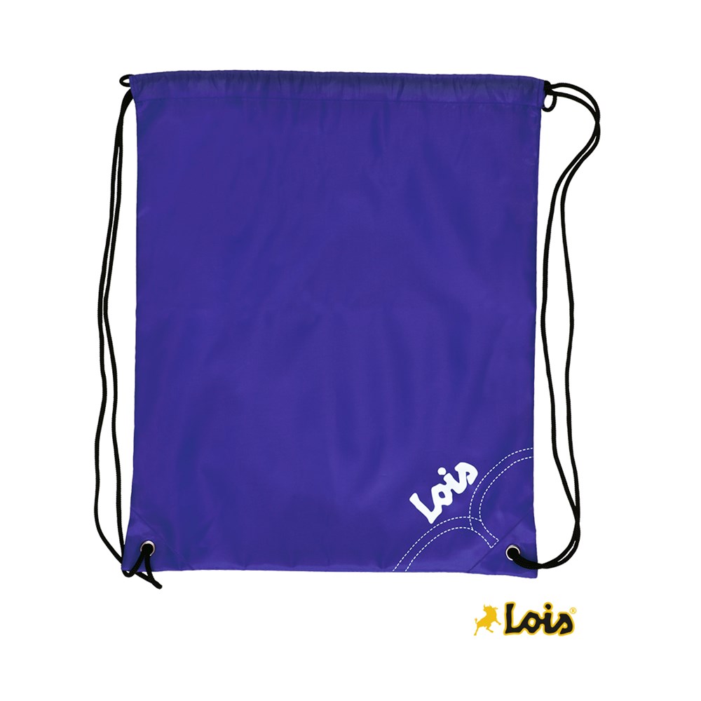 Rucksack mit Kordelzug von Lois aus weichem 210D Polyester in vielen lebendigen Farben. Mit Zugbändern in Schwarz und verstärkten Ecken mit Metallringen sowie Markenlogo in einer Ecke.