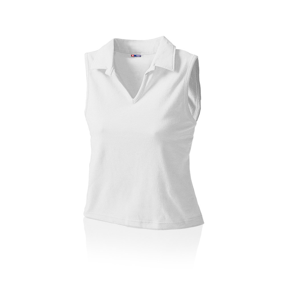 Ärmelloses Poloshirt für Mädchen aus einer Baumwoll/Lycra-Kombination (215 g/m2). Erhältlich in einer Vielzahl von Farben und den Größen M und L.