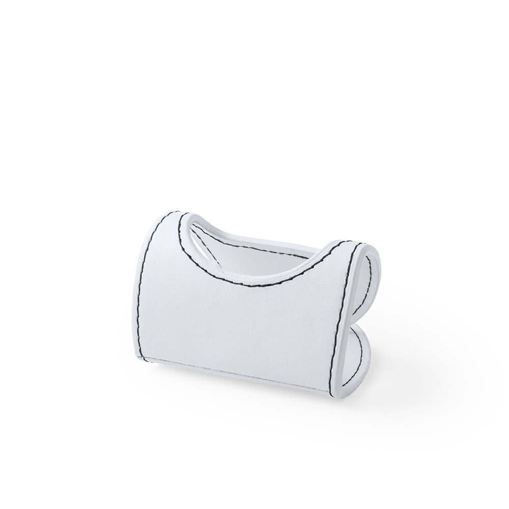 Klappbarer Ständer aus Kunstleder in schlichten Farben mit Kontrastnähten. Geeignet für Fernbedienungen und andere Geräte. Präsentiert in flachem Zustand für einfaches Bedrucken.